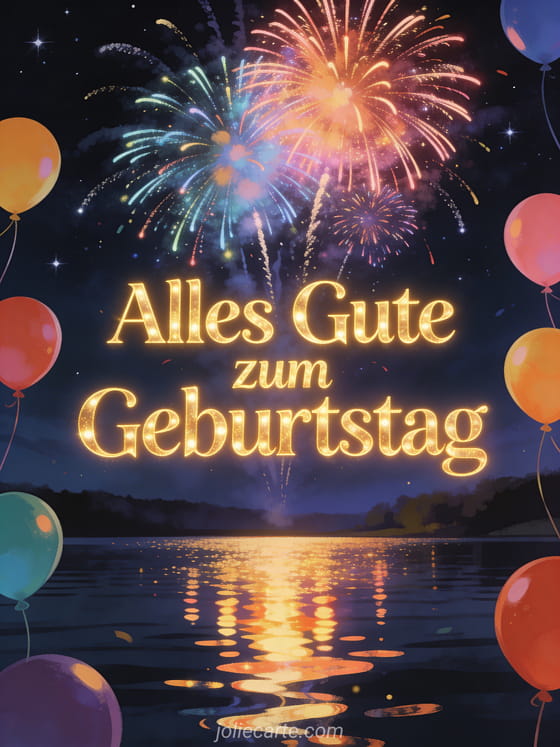 Feiern Sie einen Geburtstag mit dieser großartigen Karte mit spektakulärem buntem Feuerwerk am Sternenhimmel über einem See, Lichtreflexionen auf dem Wasser und bunten Luftballons. Entdecken Sie auch eine Geburtstagskarte für die kleine Schwester oder eine Geburtstagskarte Schwester.
