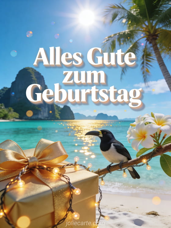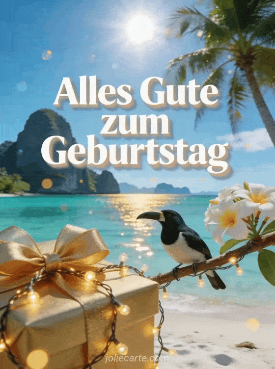 Verschönern Sie den besonderen Tag eines lieben Menschen mit dieser wunderschönen animierten Geburtstagskarte mit einer türkisen tropischen Lagune, einer Kohlmeise auf Frangipani-Blüten und goldenen Lichtreflexen auf dem Wasser. Entdecken Sie auch eine musikalische animierte Geburtstagskarte oder eine hübsche animierte Geburtstagskarte.