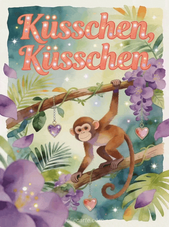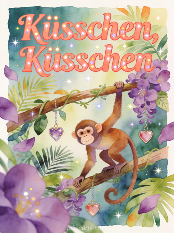 Sende einen verspielten Kussgruß mit korallenfarbener Schrift, einem Dschungelast, einem Affen, Veilchenblüten, hängenden Herzanhängern und tropischen Blättern. Entdecke auch Küsse senden Bild, ein Murmeltier Küsse gif oder kostenlose ai küsschen.