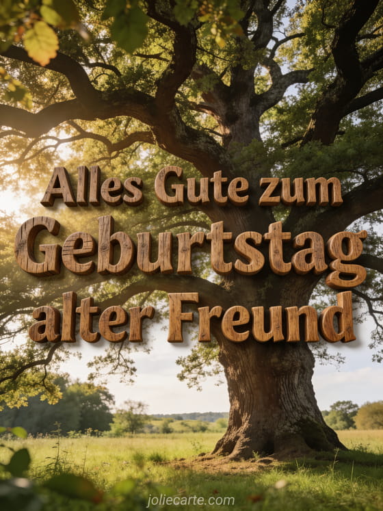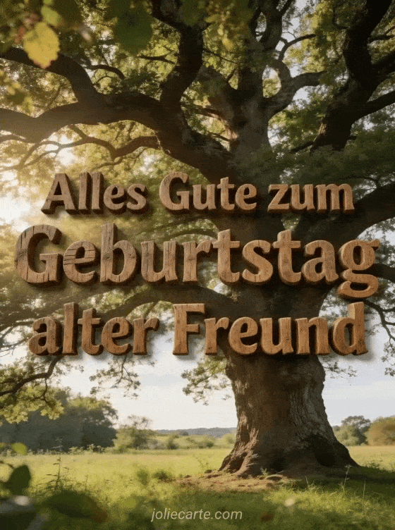 Feiere einen alten Freund mit einer Geburtstagskarte mit majestätischer Eiche in grüner Wiese und goldenem Licht durch die Blätter. Entdecke auch alles Gute zum Geburtstag wünschen, Karte alles Gute zum Geburtstag GIF und Geburtstagsnachricht alles Gute.