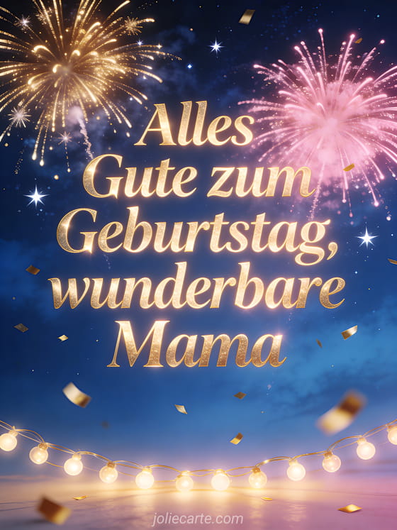 Feiere eine wunderbare Mama mit warmer goldener Schrift, einem spektakulären goldenen und rosa Feuerwerk in tiefblauem Nachthimmel, funkelnden Sternen, fallendem goldenem Konfetti und leuchtenden Girlanden. Sende auch ein alles Gute zum Geburtstag Mama animiert, eine alles Gute zum Geburtstag Mama Karte oder eine alles Gute zum Geburtstag Karte für eine junge Mama.