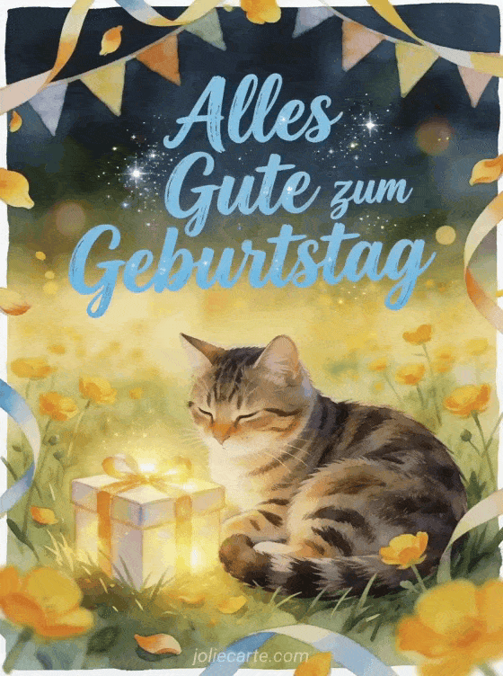 Sende deiner Enkelin eine süße Geburtstagskarte mit einer Tigerkatze, die neben einer leuchtenden Geschenkbox in einer fröhlichen Butterblumenwiese liegt. Vielleicht gefällt dir auch eine geburtstag für meine enkelin Karte oder ein Alles Gute zum Geburtstag Enkelin Bild für einen weiteren warmen Wunsch.