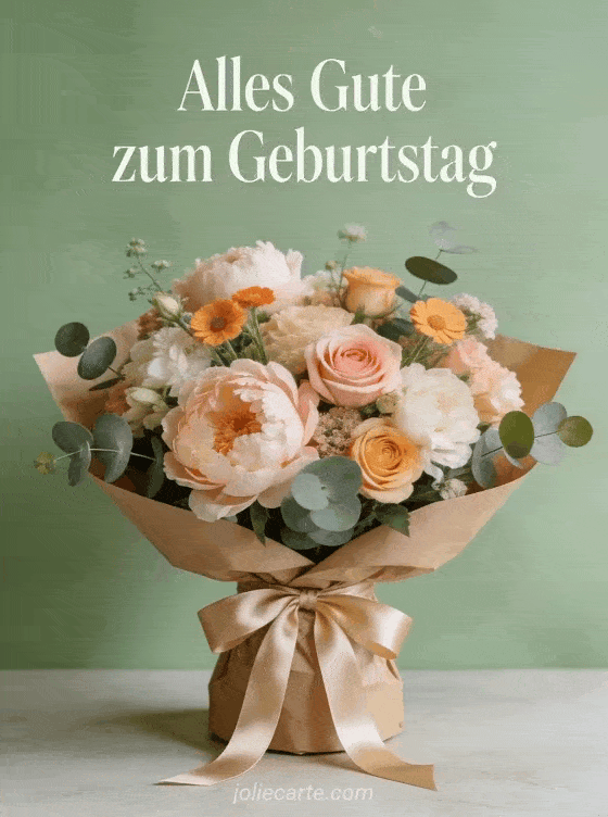Senden Sie diese wunderschöne animierte Geburtstagskarte mit einem luxuriösen Strauß aus Pfingstrosen, Rosen und Ranunkeln, eingewickelt in Kraftpapier. Entdecken Sie auch animierte Geburtstags-E-Cards kostenlos oder eine Alles Gute zum Geburtstag Katze Gif Karte.