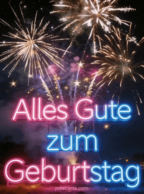 Sende dieses spektakuläre animierte GIF mit Neonlichtern und buntem Feuerwerk am Nachthimmel. Entdecke auch ein animiertes Bild Herzlichen Glückwunsch oder eine Geburtstagskarte animiertes GIF kostenlos.