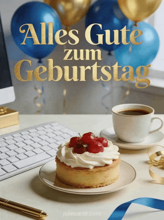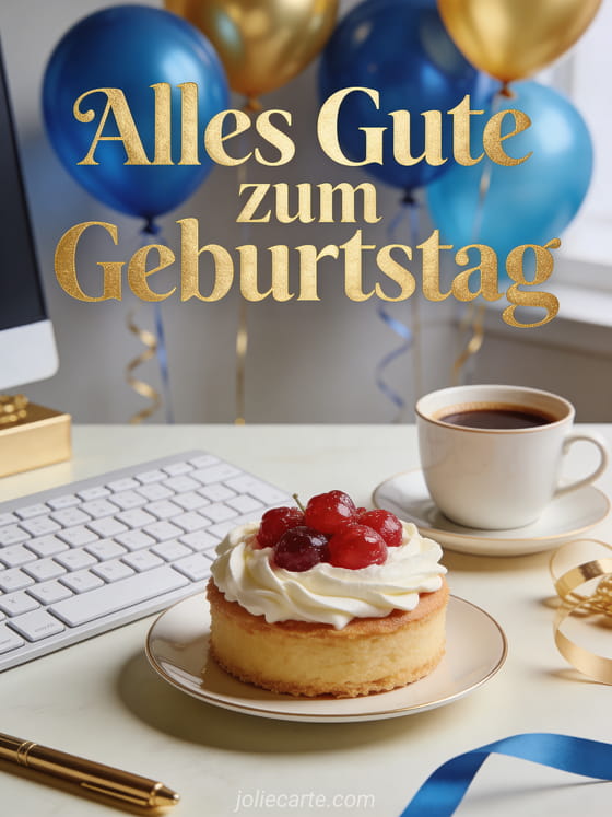 Senden Sie einem Arbeitskollegen eine freundliche Geburtstagsbotschaft mit einer gepflegten Büroszene, einem kleinen Kuchen, Kaffee und blau-goldenen Ballons. Dazu passt auch eine Alles Gute zum Geburtstag Chef Karte für einen weiteren beruflichen Gruß.