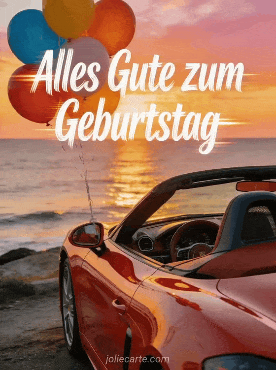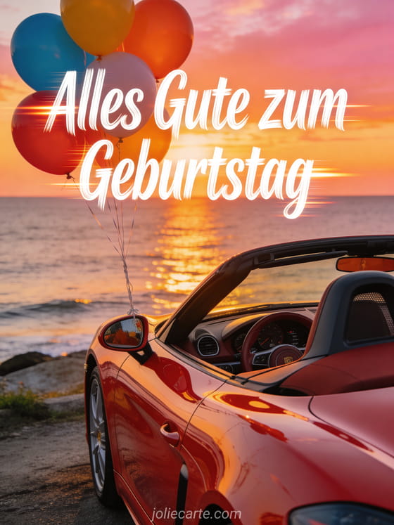 Feiere mit einer Auto-Geburtstagskarte mit rotem Cabrio, Meereshorizont, Ballons und goldener Freiheit im Sonnenuntergang. Entdecke auch alles Gute zum Geburtstag Blumen Natur, alles gute zum geburtstag schokolade und geburtstag ecard.