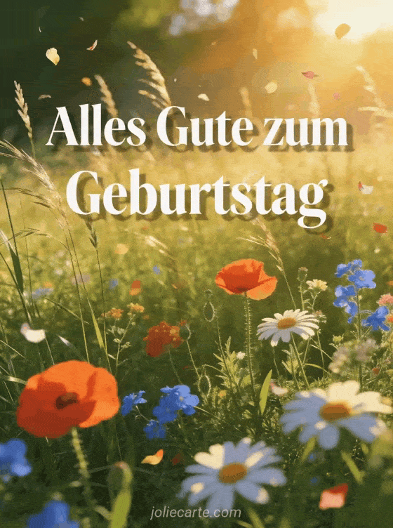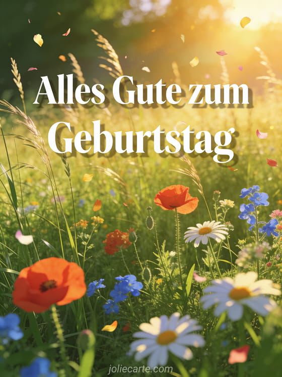 Feiere mit einer Geburtstagskarte Blumen Natur mit Mohnblumen, Margeriten und ländlichem Sonnenuntergangszauber. Entdecke auch alles gute zum geburtstag schokolade, alles gute zum geburtstag strand sonne und Alles Gute zum Geburtstag voller Glück.