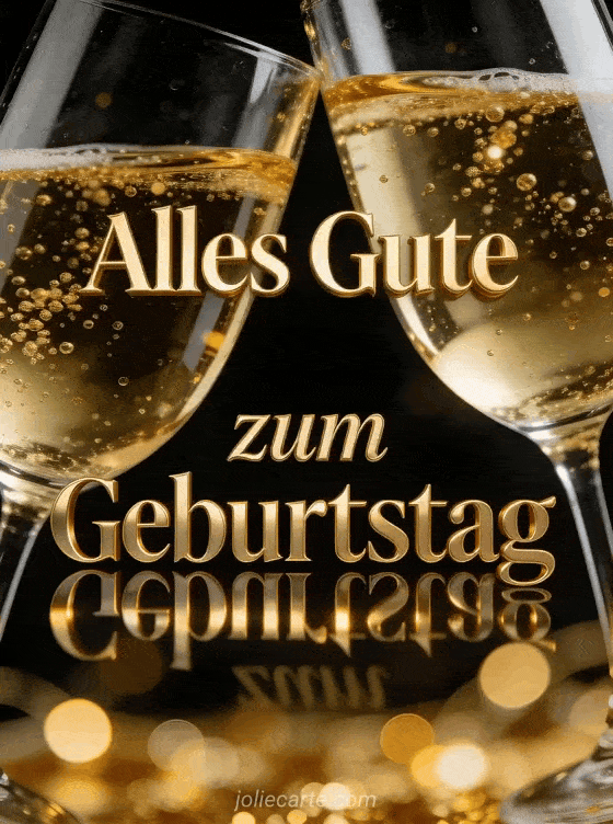Teile eine glamouröse Geburtstagsfeier mit zwei anstoßenden Champagnergläsern und goldenen Blasen auf einem tiefen schwarzen Hintergrund. Entdecke auch Alles Gute zum Geburtstag Blumen oder Herzlichen Glückwunsch GIFs.