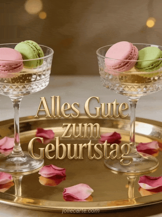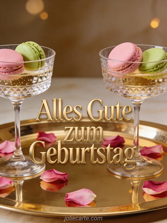 Feiern Sie ihren Geburtstag stilvoll mit dieser eleganten Karte mit Kristall-Champagnergläsern, zartrosafarbenen und Pistazien-Macarons auf einem goldenen Tablett, verstreuten Rosenblättern und warmer Ambientebeleuchtung. Entdecken Sie auch eine Alles Gute zum Geburtstag Frau oder eine Pfingstrose Geburtstagskarte Frau Blumen.