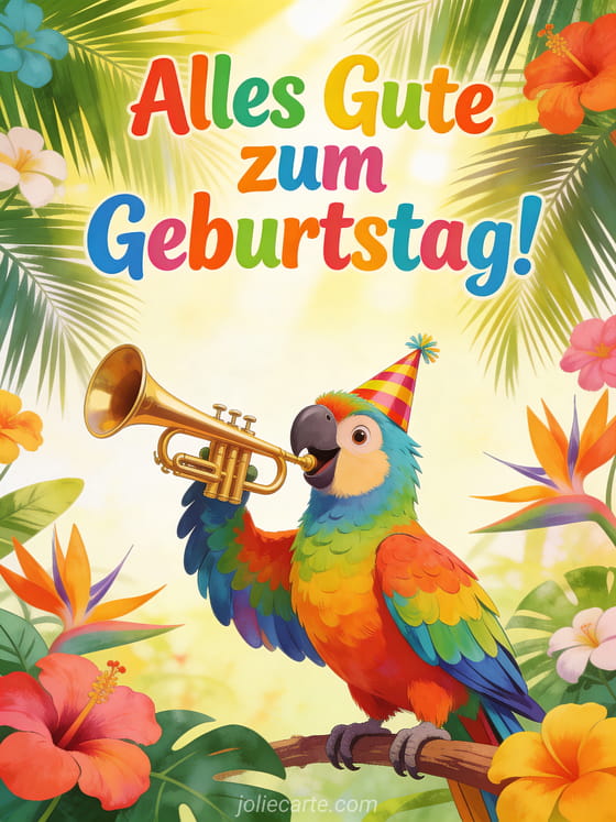 Überraschen Sie eine besondere Frau mit dieser lustigen Geburtstagskarte, auf der ein bunter Papagei mit Partyhut in eine Trompete bläst. Entdecken Sie auch eine Geburtstagskarte für Frauen oder eine Geburtstagskarte mit Bildern für Frauen.