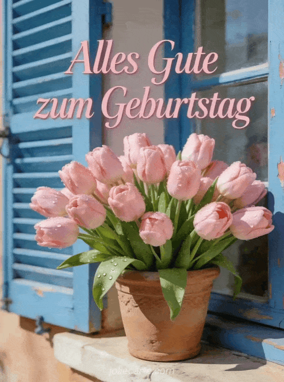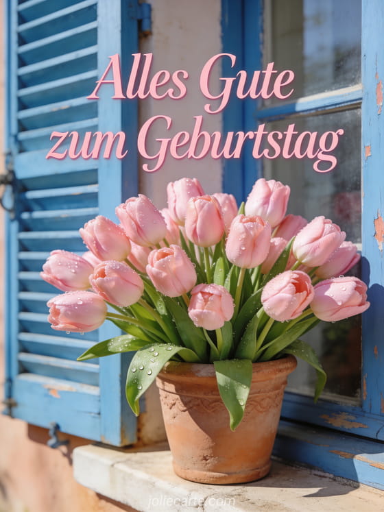 Wünschen Sie ihr alles Gute zum Geburtstag mit dieser bezaubernden Karte mit frischen rosa Tulpen in einem Terrakotta-Topf auf einer provenzalischen Fensterbank mit blauen Fensterläden im warmen mediterranen Licht. Entdecken Sie auch eine Geburtstagskarte Frau Wildblumen, eine Geburtstagskarte Frau Pfingstrosen oder einen Geburtstagsstrauß für Frauen.