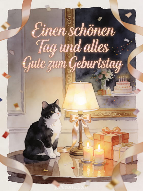 Senden Sie einen eleganten Geburtstagsgruß mit einer schwarz-weißen Katze in Aquarell, einer leuchtenden Schreibtischlampe, Satinbändern, Geschenken und Geburtstagskerzen. Dazu passen eine Geburtstagsnachricht Arbeitskollege Karte, eine Alles Gute zum Geburtstag von einer Arbeitskollegin Karte oder eine Alles Gute zum Geburtstag an meine Arbeitskollegin Karte.