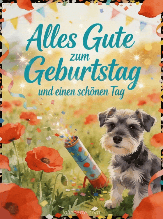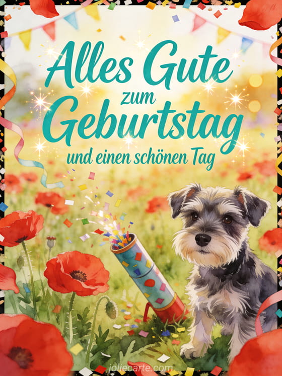 Feiere deine Enkelin mit einer hellen Aquarellkarte, die einen Zwergschnauzer-Welpen neben einer Konfettikanone in einem Feld voller roter Mohnblumen zeigt. Entdecke auch eine alles gute zum geburtstag an meine enkelin Karte, eine geburtstag für meine enkelin Karte oder ein Alles Gute zum Geburtstag Enkelin Bild.