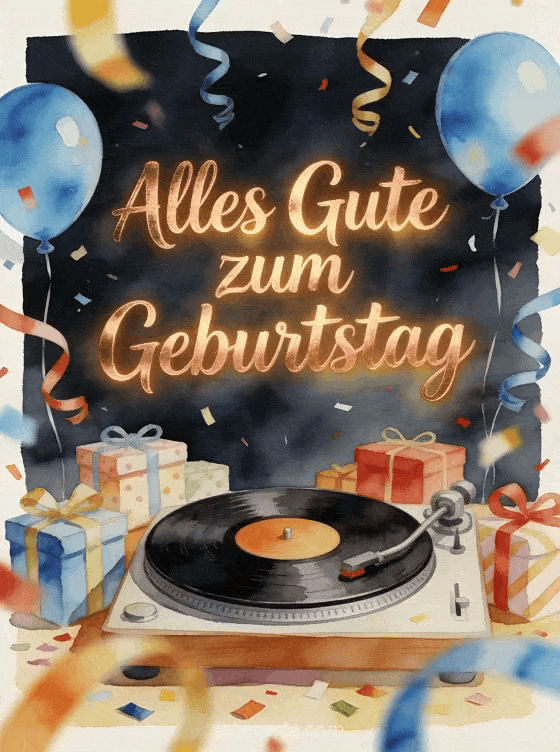 Senden Sie eine warme Retro-Geburtstagsnachricht für seinen großen Bruder mit einer drehenden Schallplatte, verpackten Geschenken, blauen Ballons und gekringelten Luftschlangen. Entdecken Sie auch kleiner Bruder alles Gute zum Geburtstag mein Bruder GIF, Alles Gute zum Geburtstag mein lieber Bruder oder Geburtstags-GIF Bruder.