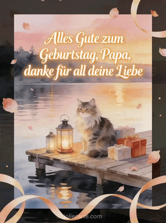 Teile ein Alles Gute zum Geburtstag Gedicht für meinen Papa mit einer Maine Coon Katze neben Laternen und verpackten Geschenken auf einem Holzsteg am ruhigen Wasser. Dazu passen Liebesgedicht für Papa zu seinem Geburtstag, Geburtstagskarte für Papa oder Gedicht Gedicht Papa alles Gute zum Geburtstag.