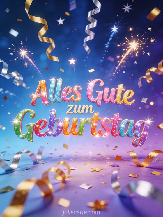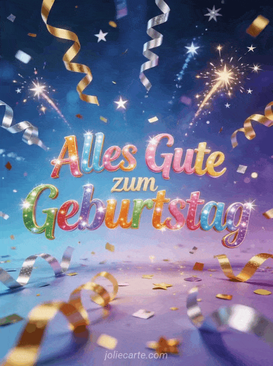 Bringe Partystimmung mit dieser ausgelassenen Geburtstagskarte voller goldenem Konfetti, Luftschlangen und funkelnden Sternen auf lebendigem Hintergrund. Entdecke auch blume alles gute zum geburtstag blumen, bild alles gute zum geburtstag mit blumen und Bild alles Gute zum Geburtstag meine Schöne.
