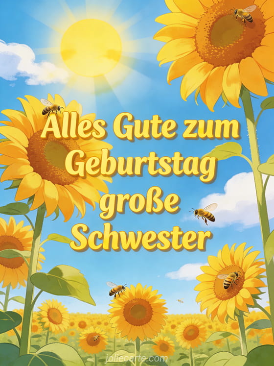 Teile diese fröhliche Sommerkarte für deine große Schwester und bringe sie zum Strahlen. Entdecke auch geburtstagsbrief schwester, alles gute zum geburtstag kleine schwester oder geburtstagsnachricht schwester.
