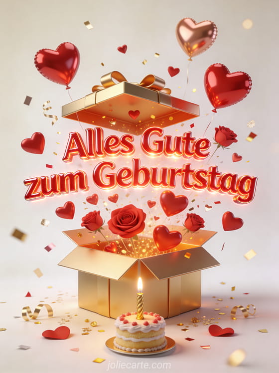 Sende eine fröhliche romantische Geburtstagskarte mit glänzender roter Schrift, 3D-Herzen aus einer goldenen Geschenkbox, Herzballons und einem kleinen Kuchen mit Kerze. Konfetti und Glitzer machen die Szene hell und festlich. Entdecke auch Alles Gute zum Geburtstag mein Herz Bild, Herz Alles Gute zum Geburtstag Herz oder Alles Gute zum Geburtstag mein Herz Bilder.
