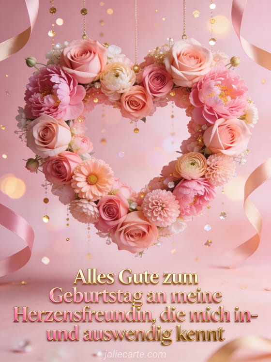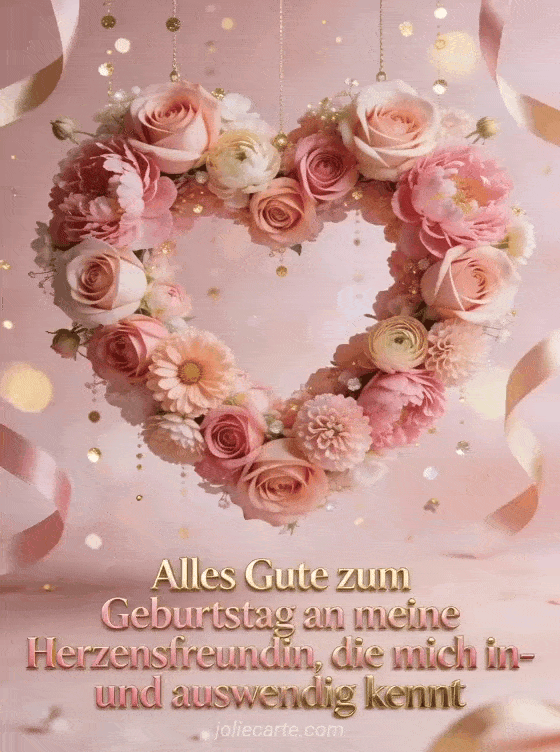 Feiere eine Freundschaft von Herzen mit rosa-goldener Schrift, einem schwebenden Blumenherz aus rosa Rosen, Pfingstrosen und Ranunkeln, goldenen Funken, Satinbändern und sanftem Bokeh-Leuchten. Du kannst auch eine Karte für alles gute zum geburtstag freundschaft, eine Karte mit lustig alles gute zum geburtstag freundin oder eine beste freundin geburtstag nachricht senden.