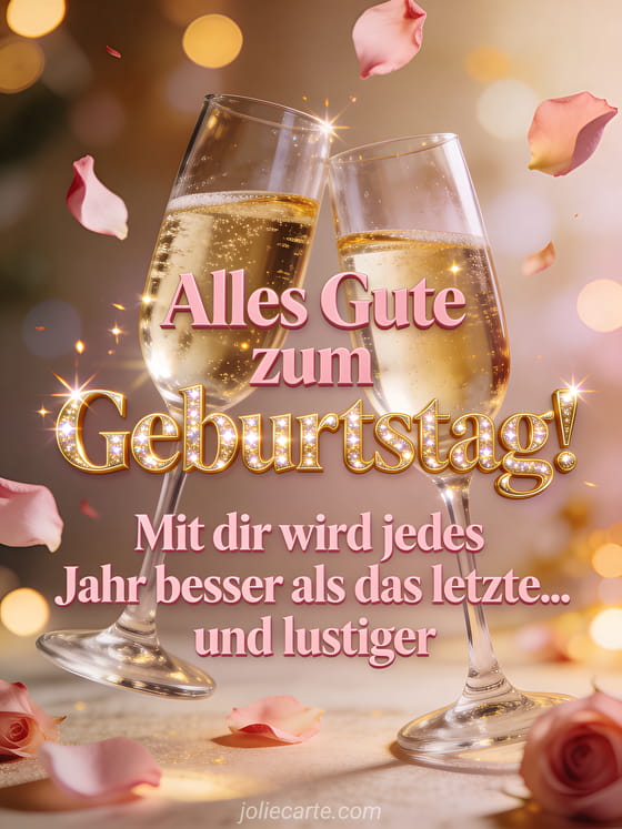 Senden Sie einen fröhlichen Geburtstagsgruß, um diesen besonderen Tag mit Eleganz und Humor zu feiern. Diese Karte erinnert uns daran, dass jedes gemeinsame Jahr besser und lustiger wird. Entdecken Sie auch einen lustigen Geburtstags-Spruch mit Humor.