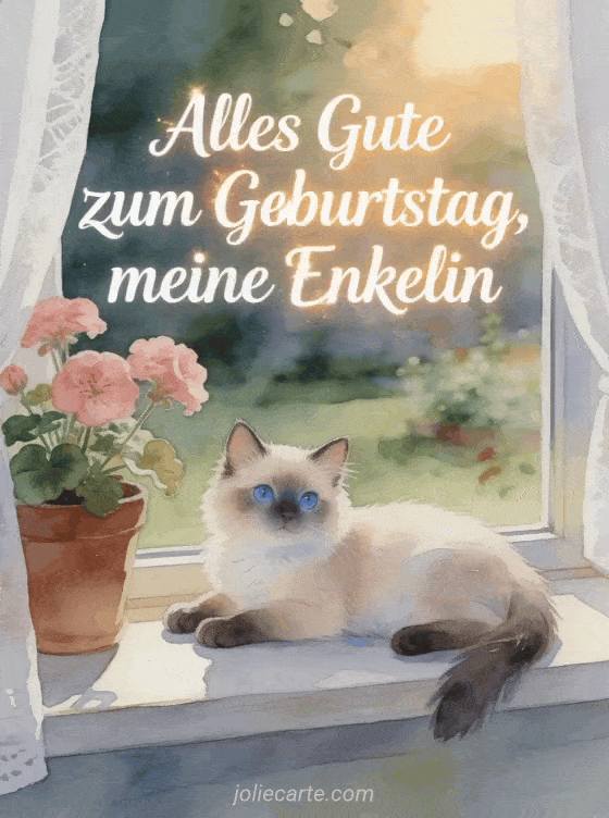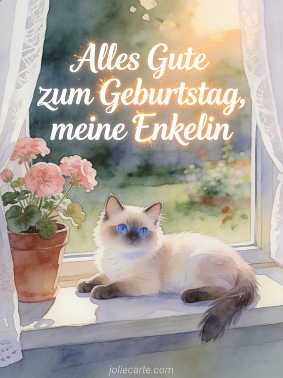 Teile eine sanfte Geburtstagskarte für deine Enkelin mit einer niedlichen blauäugigen Ragdoll-Katze auf einer Fensterbank, neben rosa Geranien und weichen Vorhängen. Entdecke auch eine Alles Gute zum Geburtstag für meine Enkelin Karte, eine alles gute zum geburtstag an meine enkelin Karte oder eine geburtstag für meine enkelin.