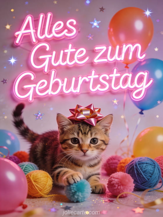 Teilen Sie eine verspielte Geburtstagskarte mit einem Tigerkätzchen, das eine Geschenkschleife auf dem Kopf trägt, umgeben von bunten Wollknäueln und Ballons auf einem weichen glitzernden Hintergrund. Dazu passen eine Alles Gute zum Geburtstag kleiner Bruder Karte, eine Geburtstag mein Bruder Karte oder eine Alles Gute zum Geburtstag mein Bruder GIF Karte.
