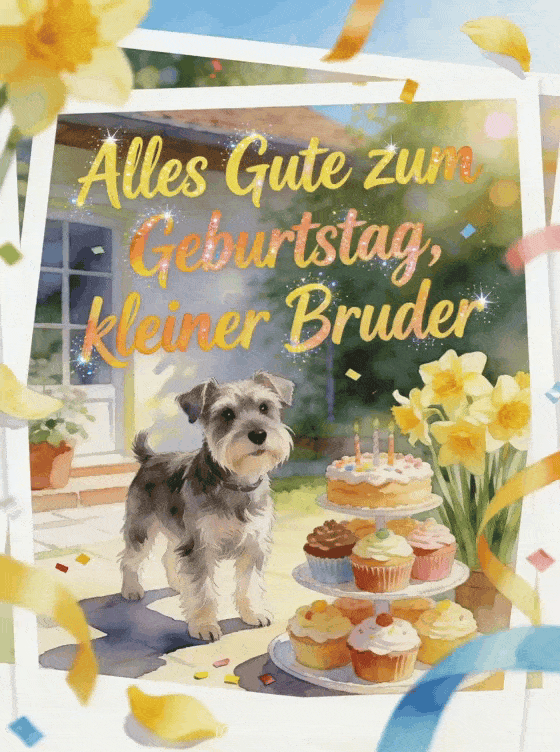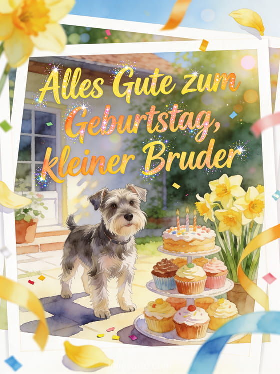 Senden Sie Ihrem kleinen Bruder einen farbenfrohen Geburtstagsgruß mit einem Zwergschnauzer in einem sonnigen Hof, einem Cupcake-Turm, Narzissen und hellen Bändern. Entdecken Sie auch Alles Gute zum Geburtstag für seinen großen Bruder SMS, Alles Gute zum Geburtstag Bruder GIF oder Alles Gute zum Geburtstag kleiner Bruder Bild.
