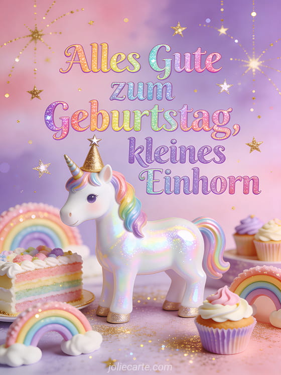 Begeistern Sie die Kleinen mit dieser magischen Karte mit einem entzückenden schillernden Einhorn in einer Regenbogenwelt. Entdecken Sie auch bild alles gute zum geburtstag baby oder geburtstagsbanner kind.