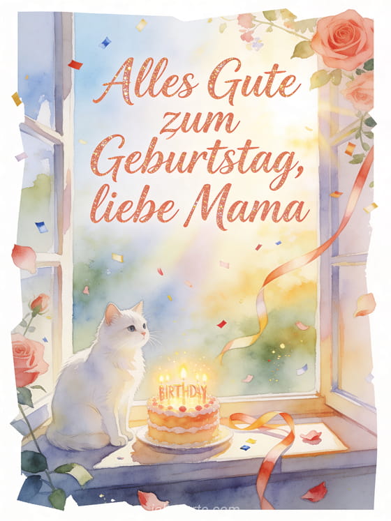 Teile Alles Gute zum Geburtstag liebe Mama im GIF-Stil mit einer weißen Katze neben einem leuchtenden Geburtstagskuchen und schwebenden Bändern auf einem sonnigen Fenstersitz. Dazu passen Alles Gute zum Geburtstag Mama GIFs, Alles Gute zum Geburtstag meine liebe Mama Bild oder Alles Gute zum Geburtstag Mama Nachricht.