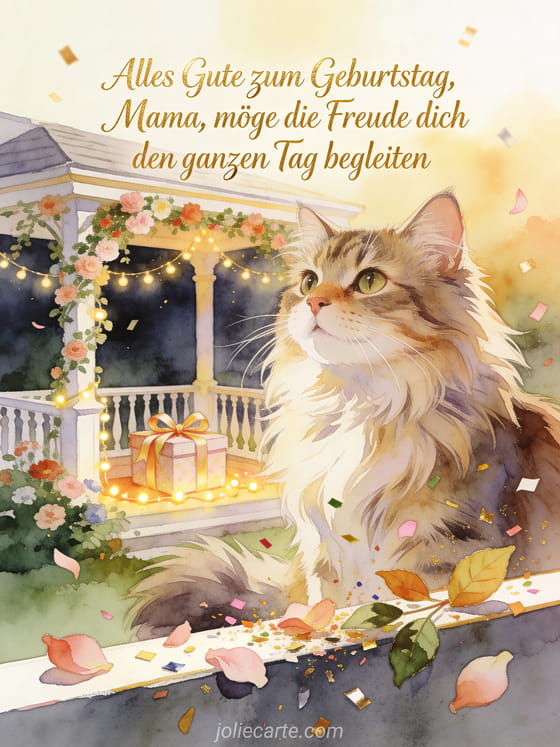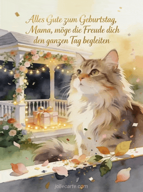 Teile einen eleganten Geburtstagswunsch für Mama mit cremefarbener Schrift, roségoldenen Akzenten, Blütenblättern, Blättern, einer Norwegischen Waldkatze, einer Geschenkbox mit Schleife und leuchtenden Girlanden auf einer blumengesäumten Veranda. Sende auch ein Alles Gute zum Geburtstag Mama GIF, ein Geburtstag junge Mama GIF oder ein Alles Gute zum Geburtstag Mama ich hab dich lieb Bild.