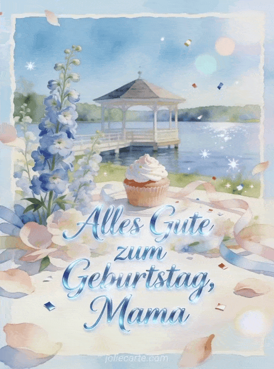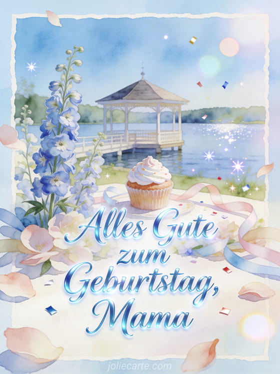 Teile einen ruhigen Geburtstagswunsch für Mama mit himmelblauer Kalligrafie, hohem Rittersporn, einem Pavillon am See, einem glasierten Cupcake, pastellfarbenen Bändern und funkelndem Konfetti. Sende auch ein Geburtstag junge Mama GIF, ein Alles Gute zum Geburtstag Mama ich hab dich lieb Bild oder ein Geburtstagsbild für Mama.