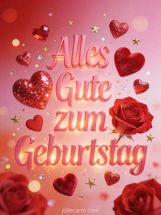 Teile einen liebevollen Geburtstagsgruß für Mama mit rosa Schrift, roten und rosafarbenen Herzen, goldenem Funkeln und warmem romantischem Leuchten. Entdecke auch eine Geburtstagskarte für die eigene Mama, eine Karte mit einfache Zeichnung für Mamas Geburtstag oder eine Karte mit Alles Gute zum Geburtstag an die eigene Mama.