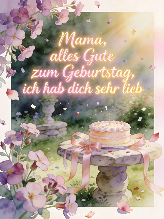 Sage Mama, wie lieb du sie hast, mit rosiger Schrift, sanftem goldenem Leuchten, Blaukissenblüten in Kaskaden, einem glasierten Kuchen, Satinbändern und einer festlichen Szene im Steingarten. Sende auch ein Geburtstagsbild für Mama, ein Alles Gute zum Geburtstag Mama animiertes GIF oder einen Text um seiner Mama alles Gute zum Geburtstag zu sagen.