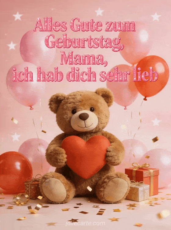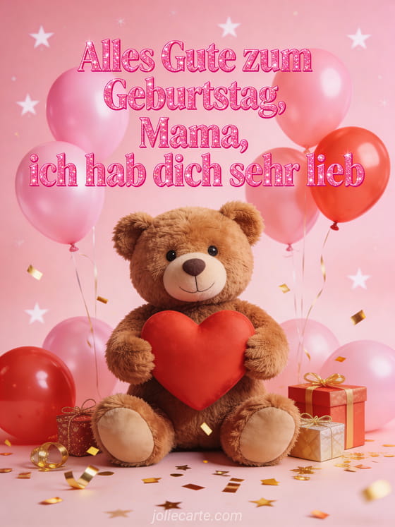 Sag Mama, dass du sie lieb hast, mit einer warmen Geburtstagskarte mit braunem Teddybär, großem rotem Herz, rosa und roten Ballons, goldenem Konfetti, kleinen Geschenken und rosigem Festleuchten. Du kannst auch eine kostenlose Geburtstagskarte Mama, eine alles Gute zum Geburtstag meine süße Mama oder eine Alles Gute zum Geburtstag Mama Zeichnung senden.