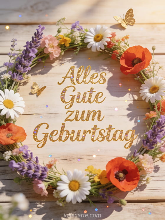 Teile einen warmen Geburtstagsgruß mit goldenen Glitzerbuchstaben, einem bunten Wildblumenkranz aus Margeriten, Lavendel und Mohnblumen, hellem Holzhintergrund, natürlichem Licht und kleinen goldenen Schmetterlingen. Sende auch eine alles Gute zum Geburtstag Karte für eine junge Mama, alles Gute zum Geburtstag Mama Bilder oder eine Geburtstagskarte Mama ich hab dich lieb.