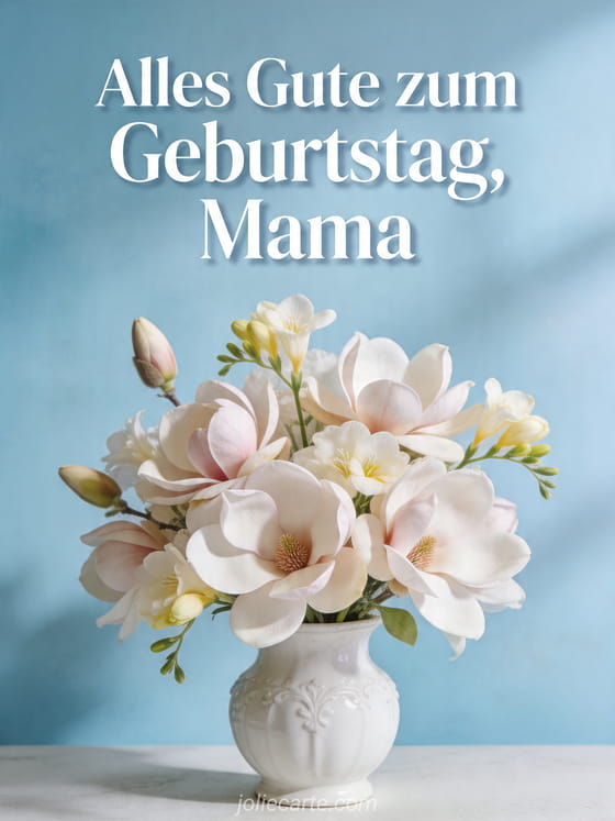 Teile einen liebevollen Geburtstagswunsch für deine Mama mit dieser sanften Blumenkarte mit Magnolien und Freesien in einer weißen Porzellanvase. Entdecke auch rührender mama geburtstag text, mama geburtstag zeichnung und rührende mama alles gute zum geburtstag karte.