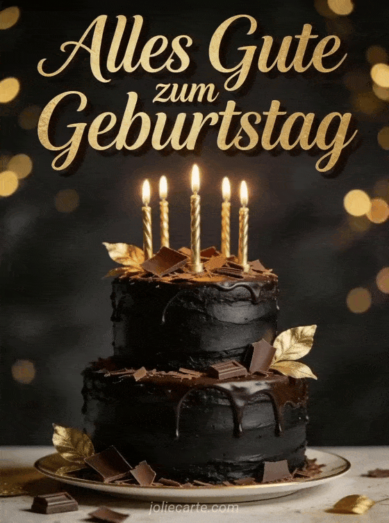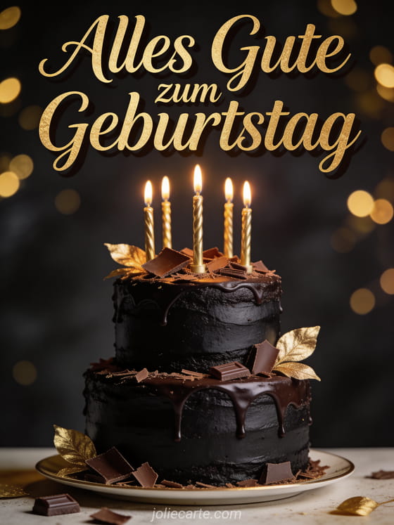 Feiern Sie seinen Geburtstag mit dieser eleganten Karte mit einer luxuriösen Schokoladentorte mit goldenen Kerzen und Goldverzierungen. Entdecken Sie auch einen Geburtstags-Text Mann mit Humor kostenlos, eine Geburtstagskarte Mann mit Humor oder ein Geburtstagszitat fĂŒr MĂ€nner.