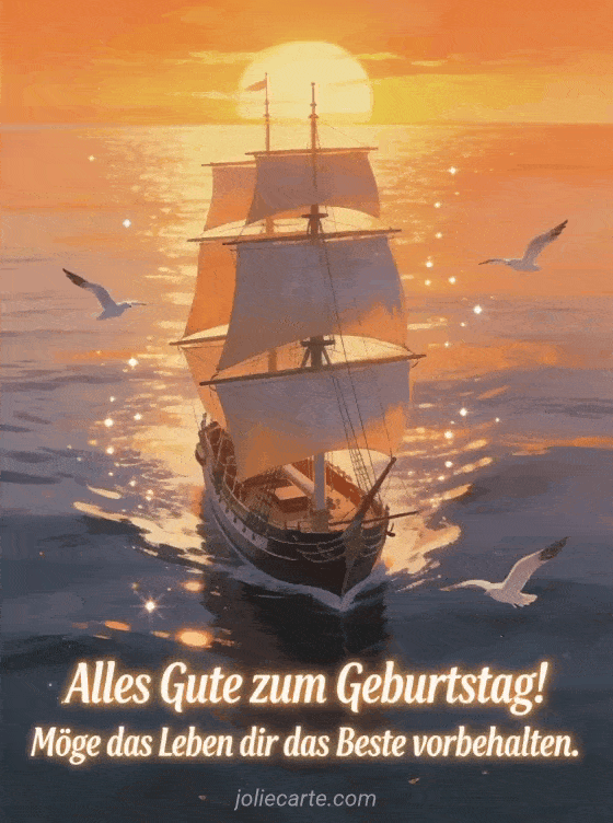 Wünschen Sie ihm alles Gute zum Geburtstag mit dieser inspirierenden Nachricht: "Möge das Leben dir das Beste vorbehalten." Diese kostenlose Karte zeigt ein majestätisches Segelboot auf ruhiger See bei Sonnenuntergang mit goldenem Himmel und fliegenden Möwen. Entdecken Sie auch eine Geburtstagskarte Mann kostenlos animiert oder Alles Gute zum Geburtstag Mann Bilder.
