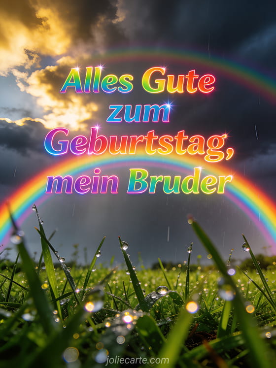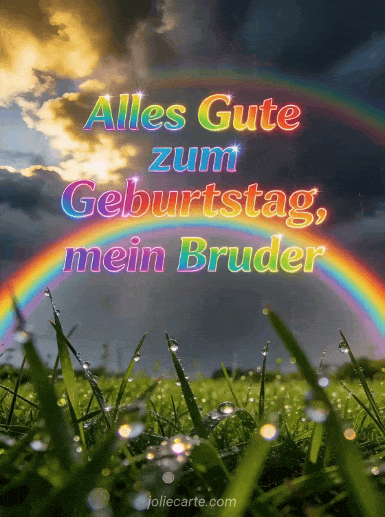 Wünschen Sie Ihrem Bruder alles Gute zum Geburtstag mit einem fotorealistischen vollständigen Doppelregenbogen über einer grünen Wiese nach dem Regen, funkelnden Tropfen und dramatischen Wolken mit goldenem Licht. Dazu passen eine kleiner Bruder alles Gute zum Geburtstag mein Bruder GIF Karte, eine Alles Gute zum Geburtstag mein lieber Bruder Karte oder eine Geburtstags-GIF Bruder Karte.