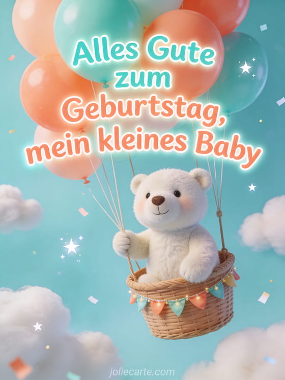 Feiere dein kleines Baby mit einer verträumten Geburtstagskarte, die einen Plüsch-Eisbären in einem Heißluftballonkorb zeigt, umgeben von bunten runden Ballons, weichen Wolken, funkelnden Sternen und leichtem Konfetti. Entdecke auch Alles Gute zum Geburtstag Tierbabys, Geburtstagstext Baby Junge 1 Jahr oder Baby wünscht Alles Gute zum Geburtstag.