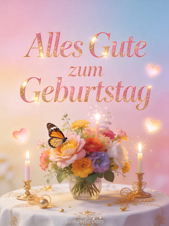 Sende einen romantischen Geburtstagsgruß mit einem fotorealistischen Strauß bunter Blumen, funkelnden Kerzen und sanft leuchtenden Herzen. Ein Schmetterling sitzt auf einer Blume über einem festlichen weißen Tisch mit goldenen Dekorationen. Entdecke auch Alles Gute zum Geburtstag mein Schatz, Alles Gute zum Geburtstag mein Schatz oder Alles Gute zum Geburtstag mein Schatz.