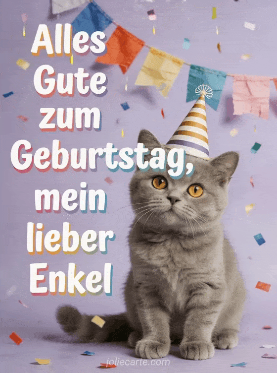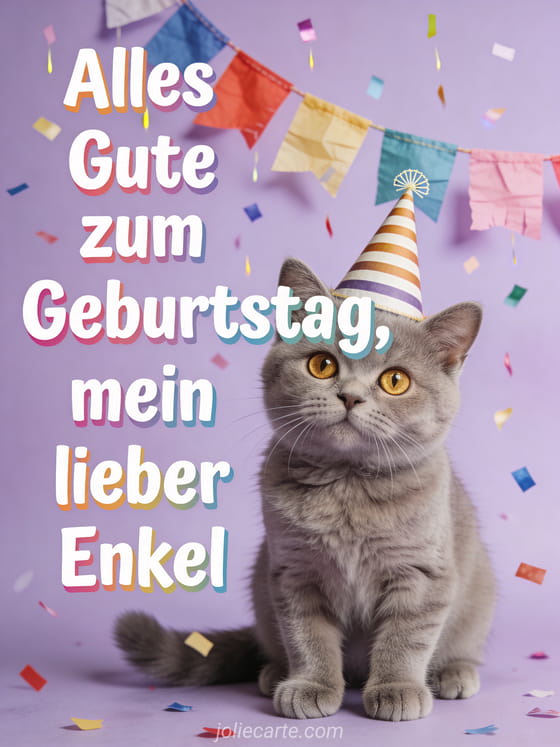 Feiere deinen lieben Enkel mit glänzender weißer Schrift, einer niedlichen grauen British Shorthair Katze mit goldenen Augen, einem gestreiften Partyhut, bunter Girlande und fallendem Konfetti auf weichem Lavendelhintergrund. Du kannst auch ein meinem Enkel alles Gute zum Geburtstag wünschen, ein seinem Enkel alles Gute zum Geburtstag wünschen oder ein Alles Gute zum Geburtstag mein Enkel senden.