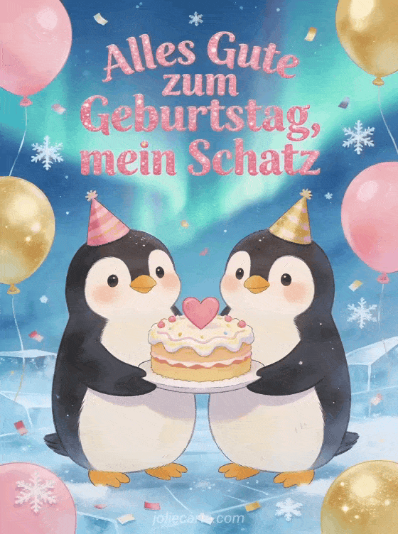 Sende einen süßen fröhlichen Geburtstagsgruß mit einem niedlichen Pinguinpaar in Partyhüten, das einen Kuchen mit einem Herz auf der Glasur hält. Rosa und goldene Ballons, Konfetti, glitzernder Schnee und eine Aurora machen die Winterszene festlich. Entdecke auch Alles Gute zum Geburtstag mein Schatz Mann animiertes GIF, romantisches Alles Gute zum Geburtstag Herz oder Alles Gute zum Geburtstag mein Schatz.