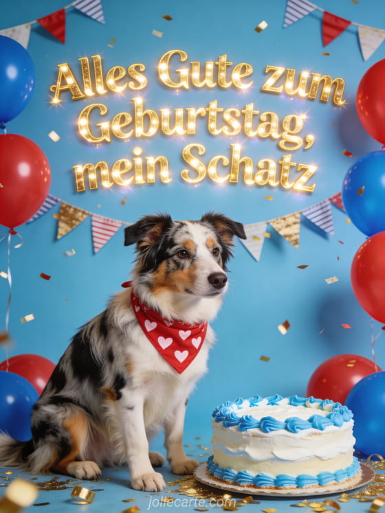 Sende einen fröhlichen Geburtstagsgruß mit einem dreifarbigen Australian Shepherd, der ein rotes Herz-Bandana trägt, neben einem blauen und weißen Kuchen. Ballons, Wimpel und goldenes Konfetti schaffen eine helle festliche Szene. Entdecke auch romantisches Alles Gute zum Geburtstag Herz, Alles Gute zum Geburtstag mein Schatz oder ein Alles Gute zum Geburtstag Glamour Bild.