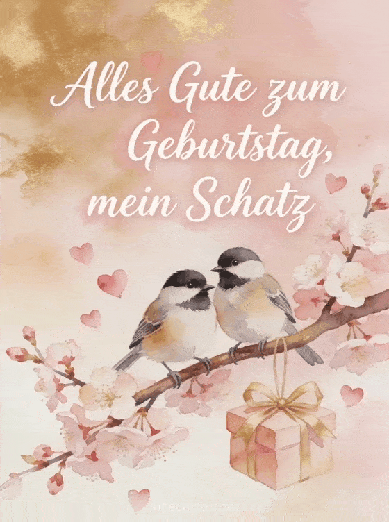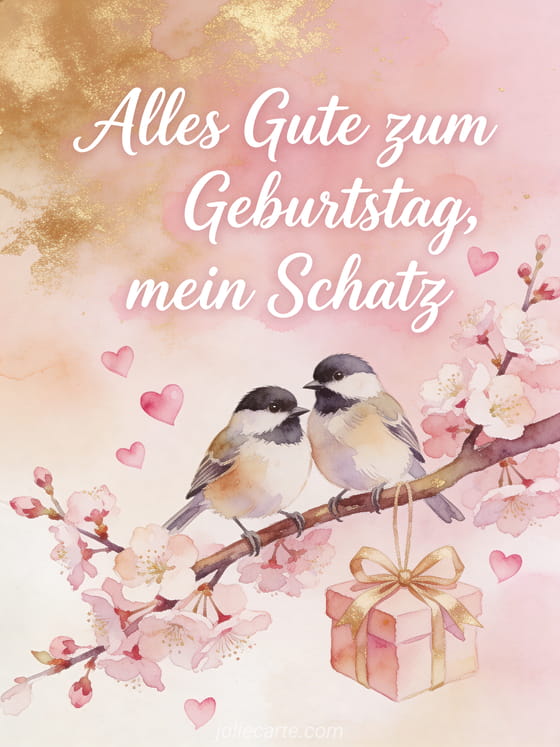 Sende einen romantischen Geburtstagsgruß mit einem zarten Aquarellpaar Blaumeisen auf einem blühenden Kirschbaumzweig. Rosa Herzen, eine Geschenkschleife und weiche Frühlingsfarben machen diese Karte liebevoll und festlich. Entdecke auch ein Geburtstagsbild für meinen Liebling, ein romantisches Geburtstagskartenbild oder romantische Geburtstagskarten.