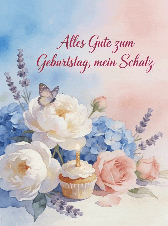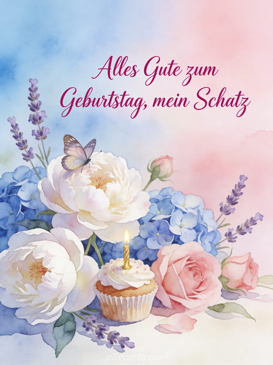 Sende einen zartlichen romantischen Geburtstagsgruß mit einem Aquarellstrauß aus blauen und rosa Hortensien, weißen Pfingstrosen und Lavendel. Ein kleiner Geburtstagskuchen und ein Schmetterling setzen einen feinen festlichen Akzent. Entdecke auch ein Alles Gute zum Geburtstag Glamour Bild, Alles Gute zum Geburtstag Herz oder ein Alles Gute zum Geburtstag mein Herz Bild.