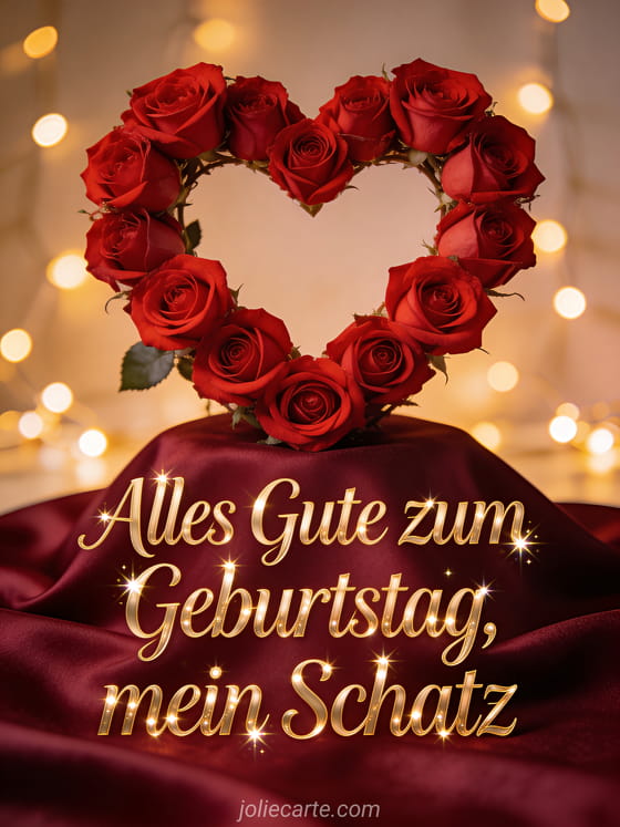 Sende einen leidenschaftlichen romantischen Geburtstagsgruß mit fotorealistischen roten Rosen, die in Herzform auf burgunderroter Seide liegen. Warme Hintergrundlichter und goldene Schrift schaffen eine elegante Botschaft für deinen Schatz. Entdecke auch Alles Gute zum Geburtstag mein Schatz, Alles Gute zum Geburtstag mein Schatz oder romantischer Geburtstag.