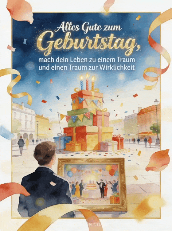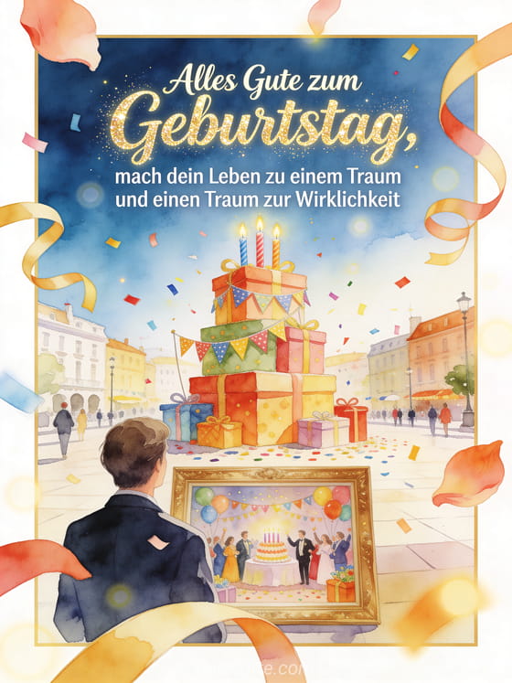 Sende eine inspirierende Geburtstagskarte mit einer hellen Aquarellfeier rund um einen hohen Turm aus Geschenken, Kerzen, Girlanden und schwebendem Konfetti. Die Botschaft ermutigt deinen Sohn, sein Leben zu einem Traum und einen Traum zur Wirklichkeit zu machen. Entdecke auch Geburtstag für einen Sohn oder Alles Gute zum Geburtstag mein Großer.