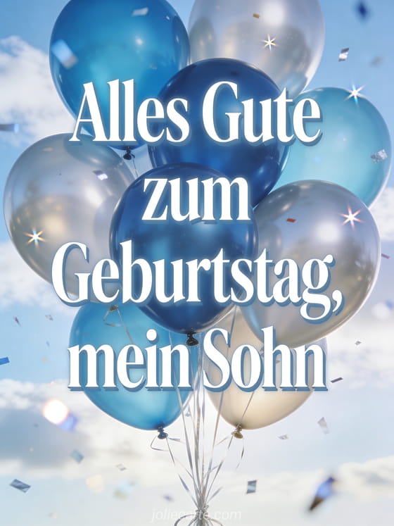 Feiere deinen Sohn mit einer fotorealistischen Geburtstagskarte, auf der blaue und silberne Ballons in einem hellen Himmel schweben, mit funkelndem Konfetti und weichen Wolken. Entdecke auch eine lustiges Alles Gute zum Geburtstag mein Sohn Karte, einen Geburtstagstext für meinen Sohn oder ein Alles Gute zum Geburtstag mein Sohn Zitat.
