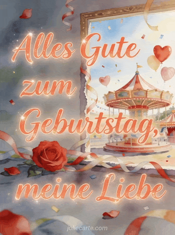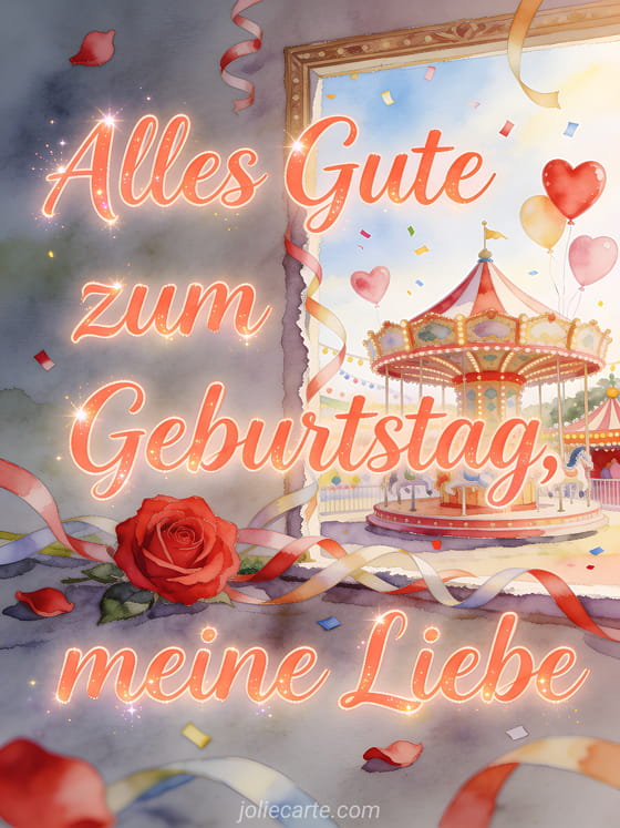 Wünsche deiner Liebe einen fröhlichen Geburtstag mit einer Aquarellkarte, die ein rotes Rosenkarussell, Herzballons, helles Konfetti und Schleifen zeigt, die über den Rahmen laufen. Personalisiere diesen romantischen Gruß online und sende ihn in wenigen Momenten kostenlos. Entdecke auch ein animiertes Alles Gute zum Geburtstag mein Schatz GIF, Geburtstagsnachrichten für meinen Schatz oder eine animierte Alles Gute zum Geburtstag Karte für meinen Schatz.